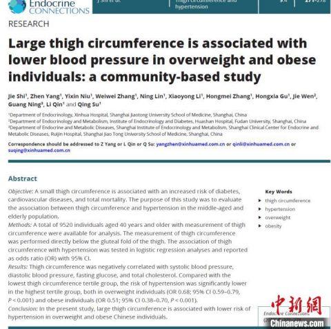 新華醫(yī)院21日披露,該院內(nèi)分泌科蘇青教授和楊振教授組成的研究小組在對近萬人進行的社區(qū)流行病學調(diào)查中發(fā)現(xiàn),與大腿較瘦的人群相比,他們屬于超重和肥胖人群。然而,大腿粗壯的人患高血壓的風險降低了近30%和50%。